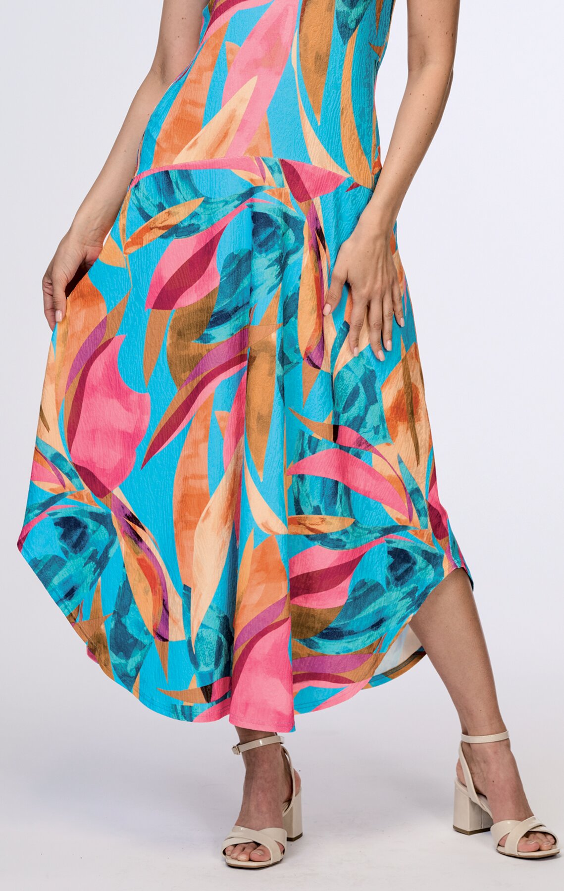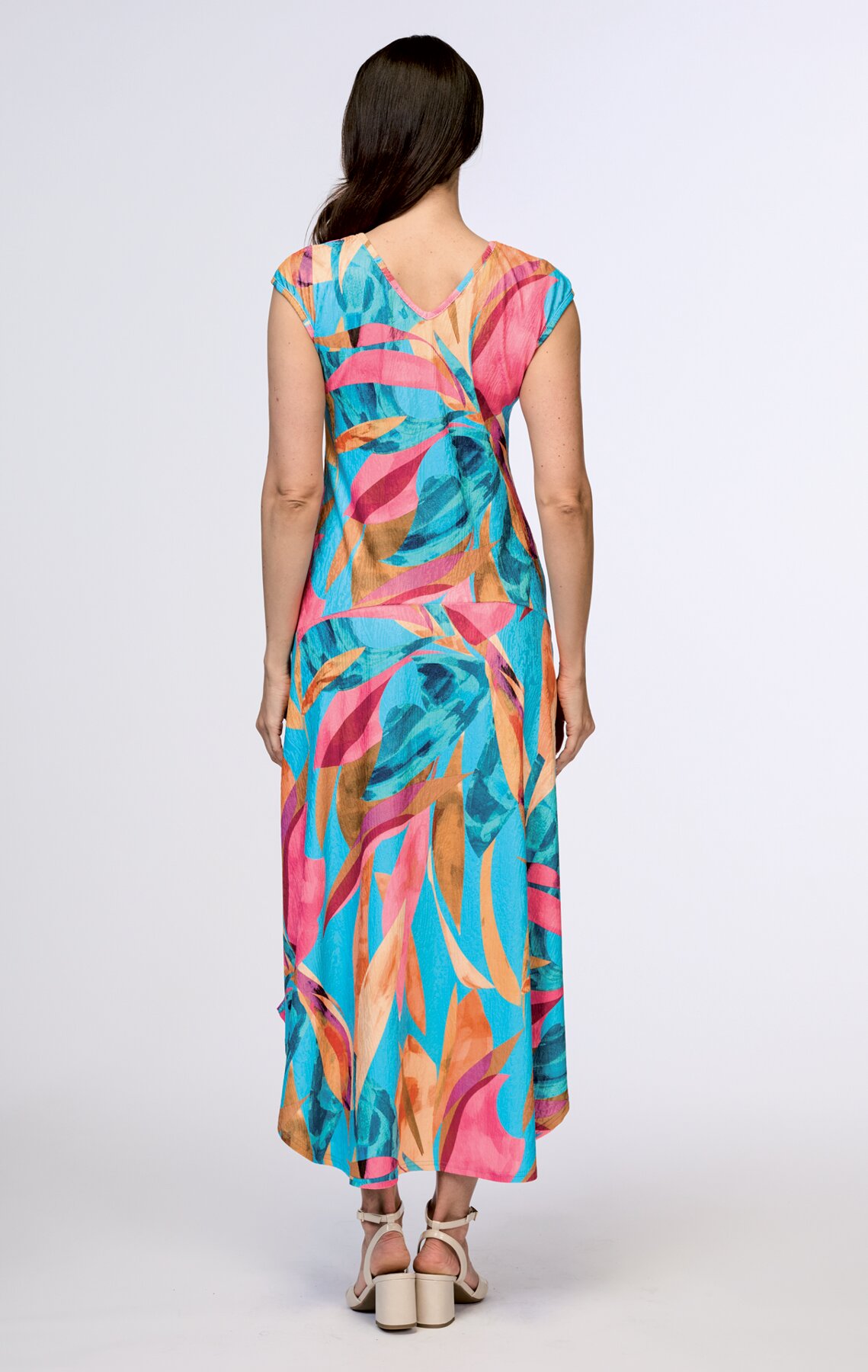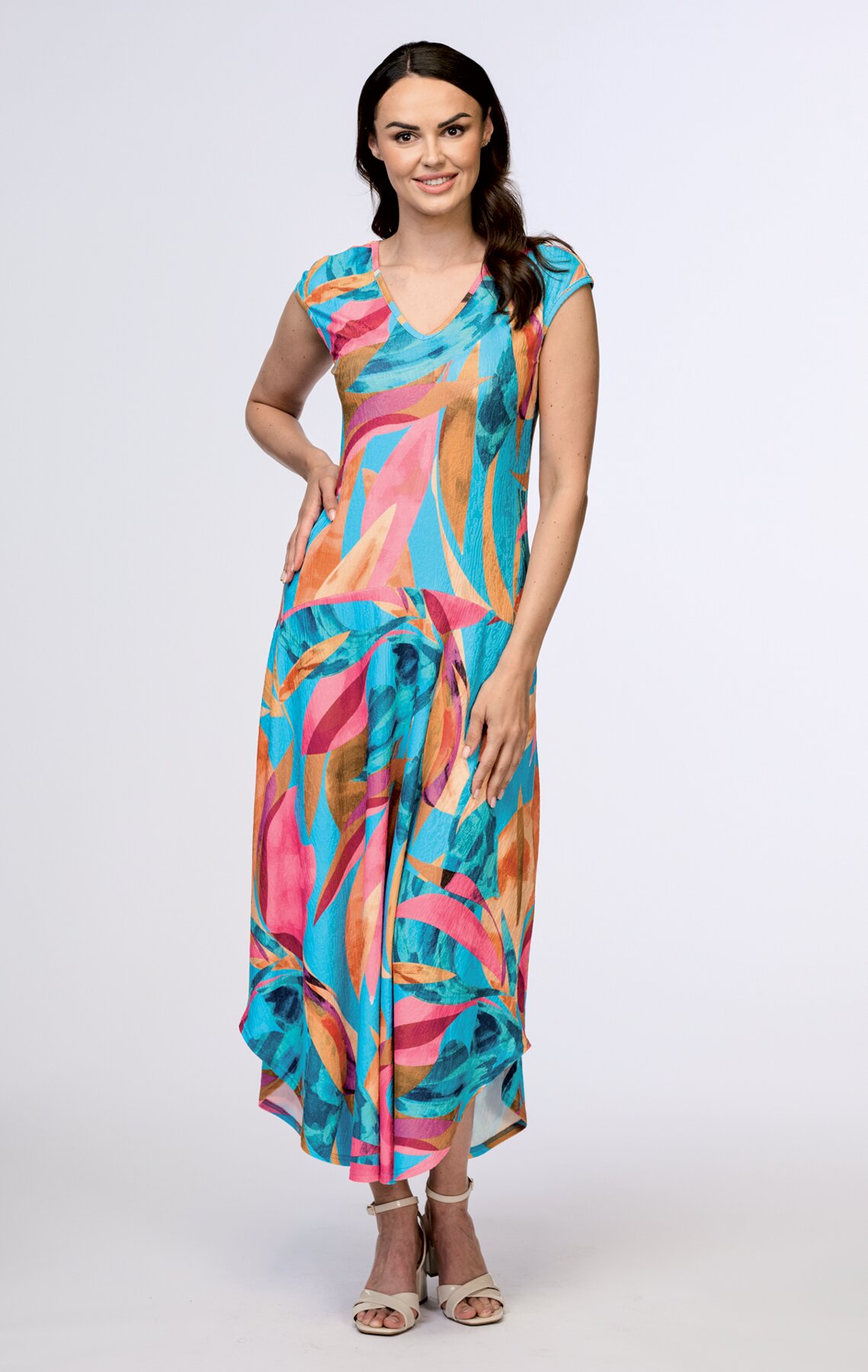 Dlouhé dámské šaty mají výstřih do V na předním i zadním díle. V pase jsou přestřižené a sukně je rozšířená a má tvarovanou délku. Jsou vyrobené z lehkého letního materiálu.