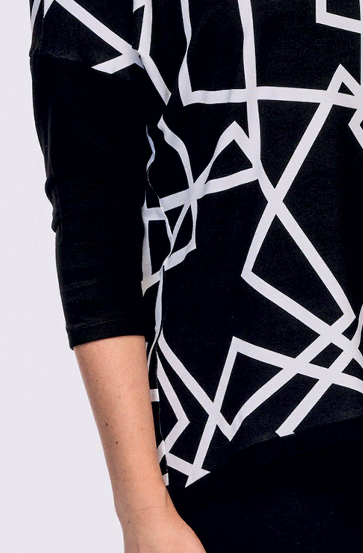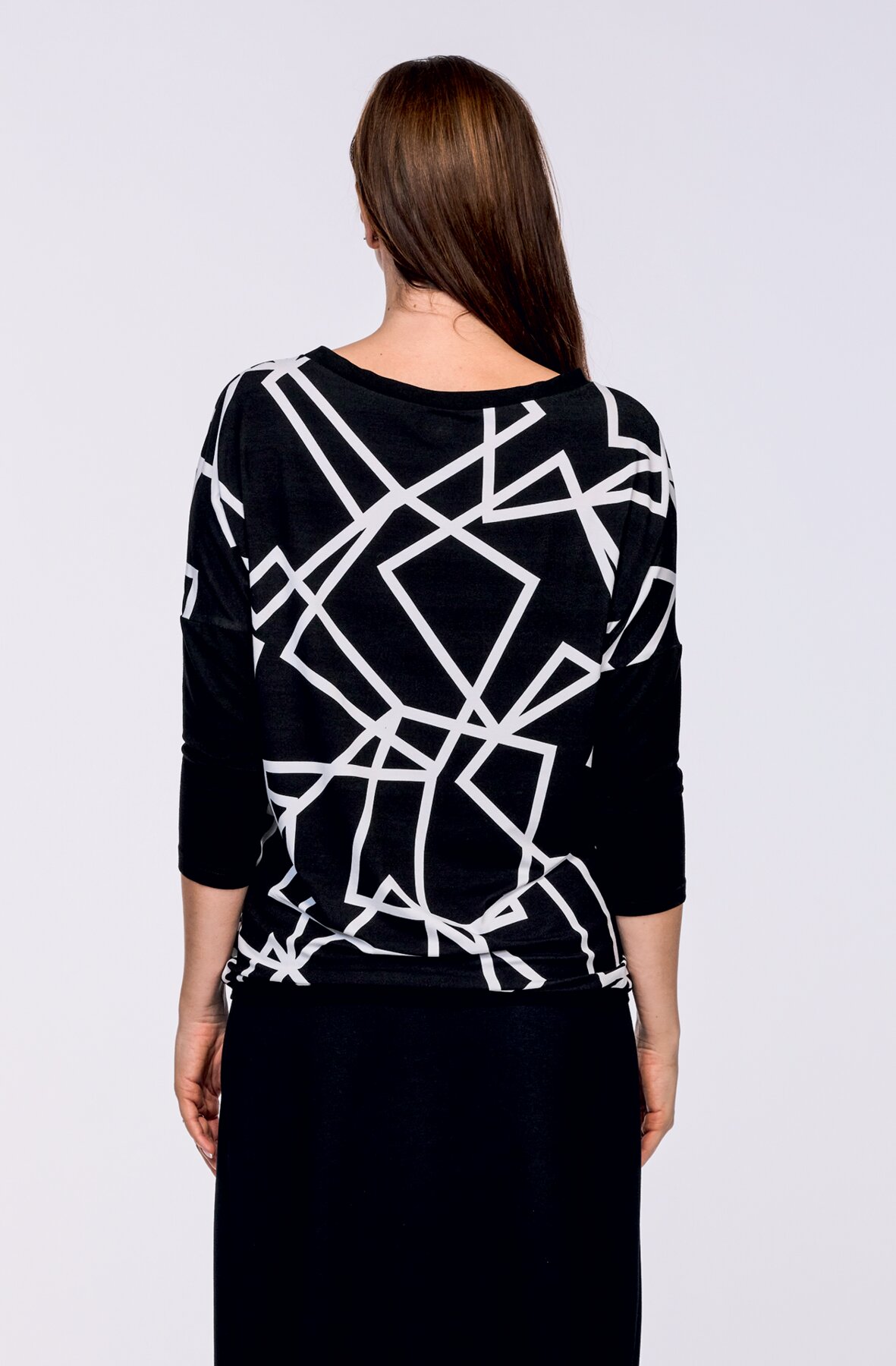 Delší dámská halenka kimonového střihu s dlouhými kontrastními rukávy a s tvarovanou délku.