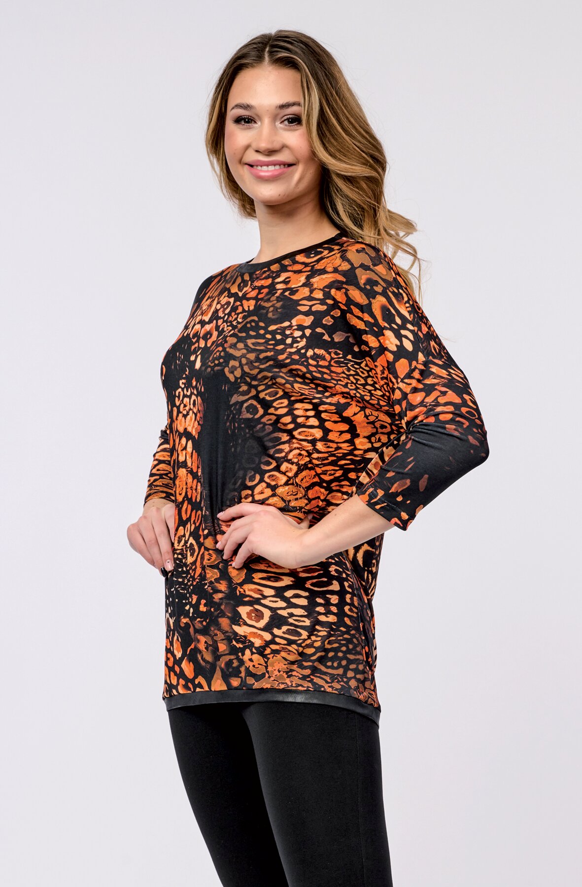 Dámská halenka kimonového střihu s dlouhými rukávy. Má kulatý výstřih s kontrastním lemem. Délka je tvarovaná s mírně prodlouženým zadním dílem a má kontrastní lem. Halenka je vyrobená z příjemného polyesterového materiálu.