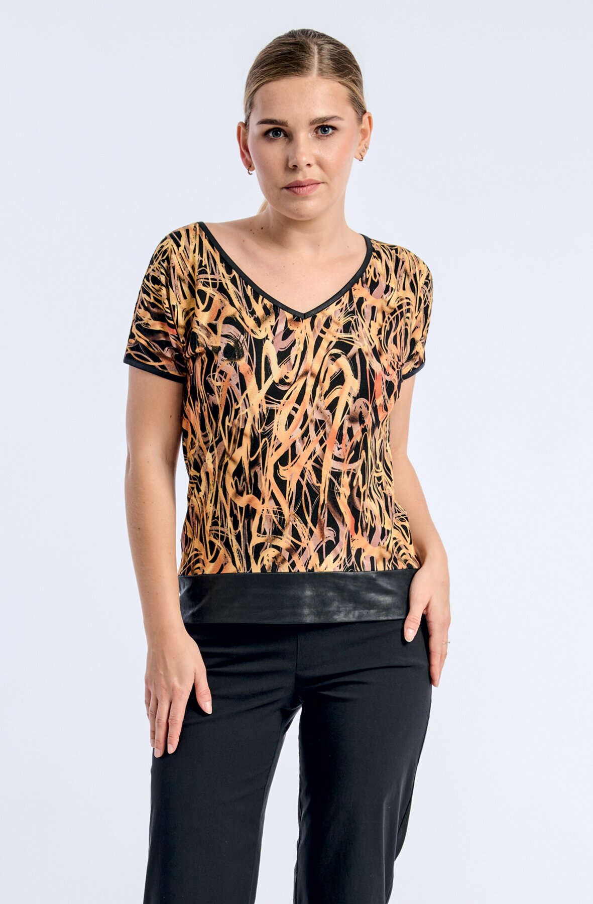 Dámská halenka kimonového střihu s výstřihem do V, který opticky zeštíhluje horní partie. Dolní kraj, rukávy a výstřih je zakončený kontrastním černým lemem, který tvoří zajímavý detail. Halenka je ušitá z viskózového úpletu s elastanem, díky němuž je pružná a pohodlná.