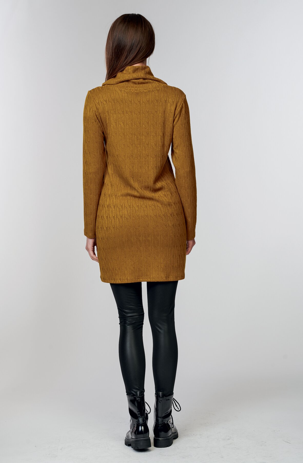 Kratší dámské šaty volnějšího střihu s kapsami a rolákem. Šaty jsou vyrobené z příjemného teplejšího materiálu a mají dlouhé rukávy.
