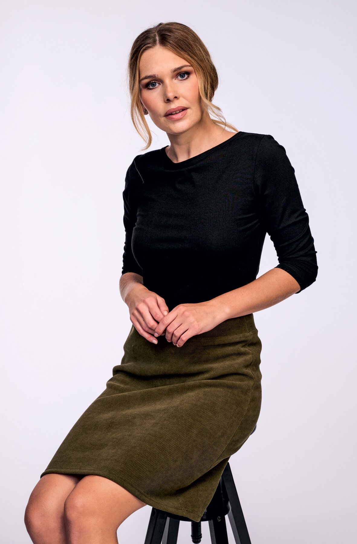 Dámská sukně s délkou ke kolenům, zadní díl je mírně prodloužený. Tato sukně je vyrobená z vroubkovaného materiálu podobného manšestru, který je pružný a příjemně měkký.