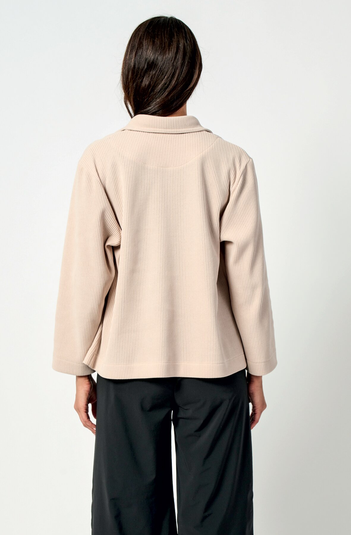 Kratší kabátek má velmi moderní hranatý střih se 7/8 rukávy. Na předním díle jsou našité větší kapsy. Klasický límec a zapínání na knoflíky dodají nadčasový charakter a ležérní styl. Je vyrobený z materiálu podobného manšestru. Je pružný a zajišťuje optimální volnost pohybu. Ideální pro každodenní městský outfit.