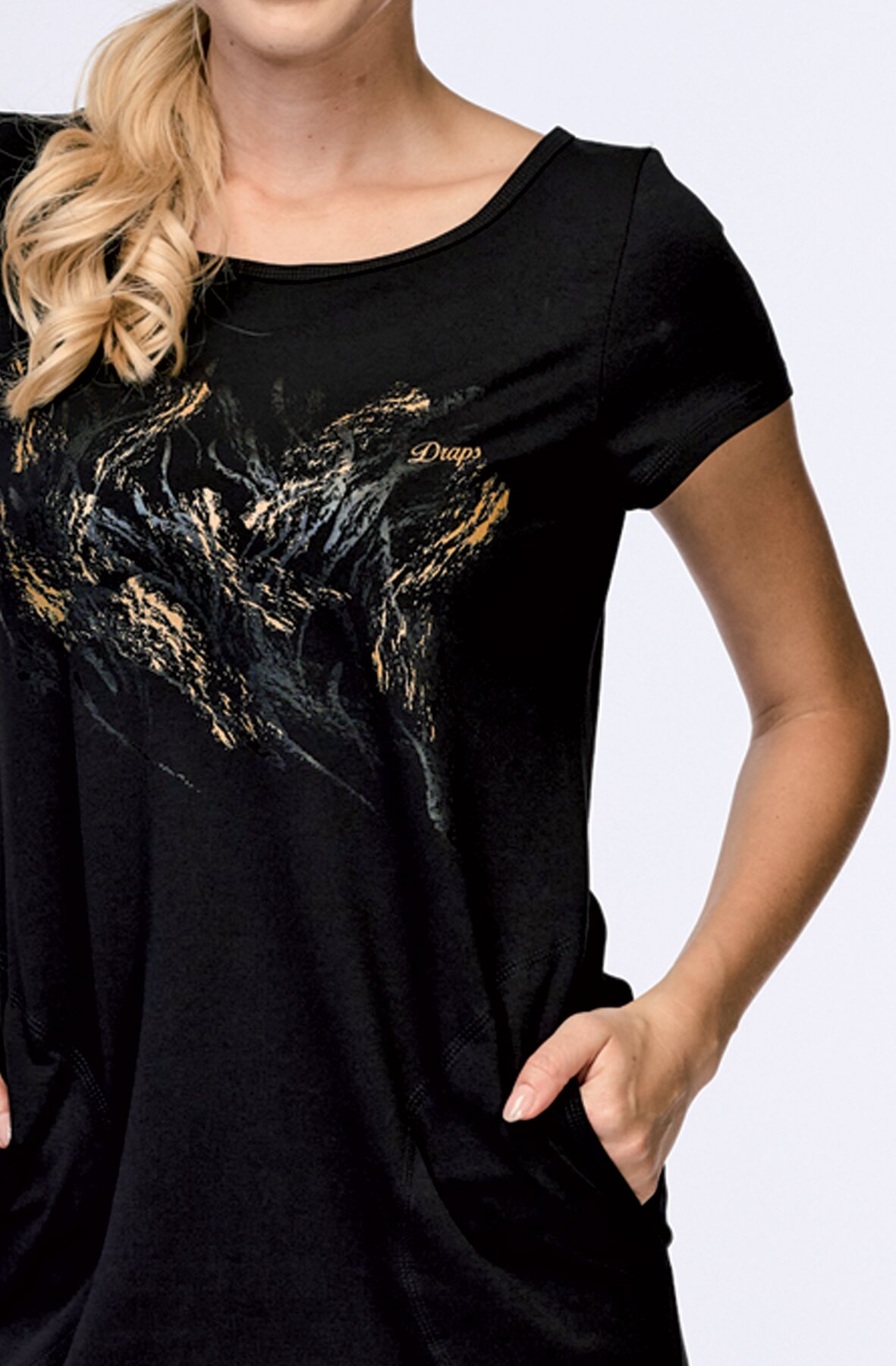 Dámské šaty volnějšího střihu s krátkým rukávem. Mají kapsy na bocích a na předním díle kontrastní potisk. Jsou v délce nad kolena. Šaty jsou vyrobené z příjemného bavlněného materiálu.