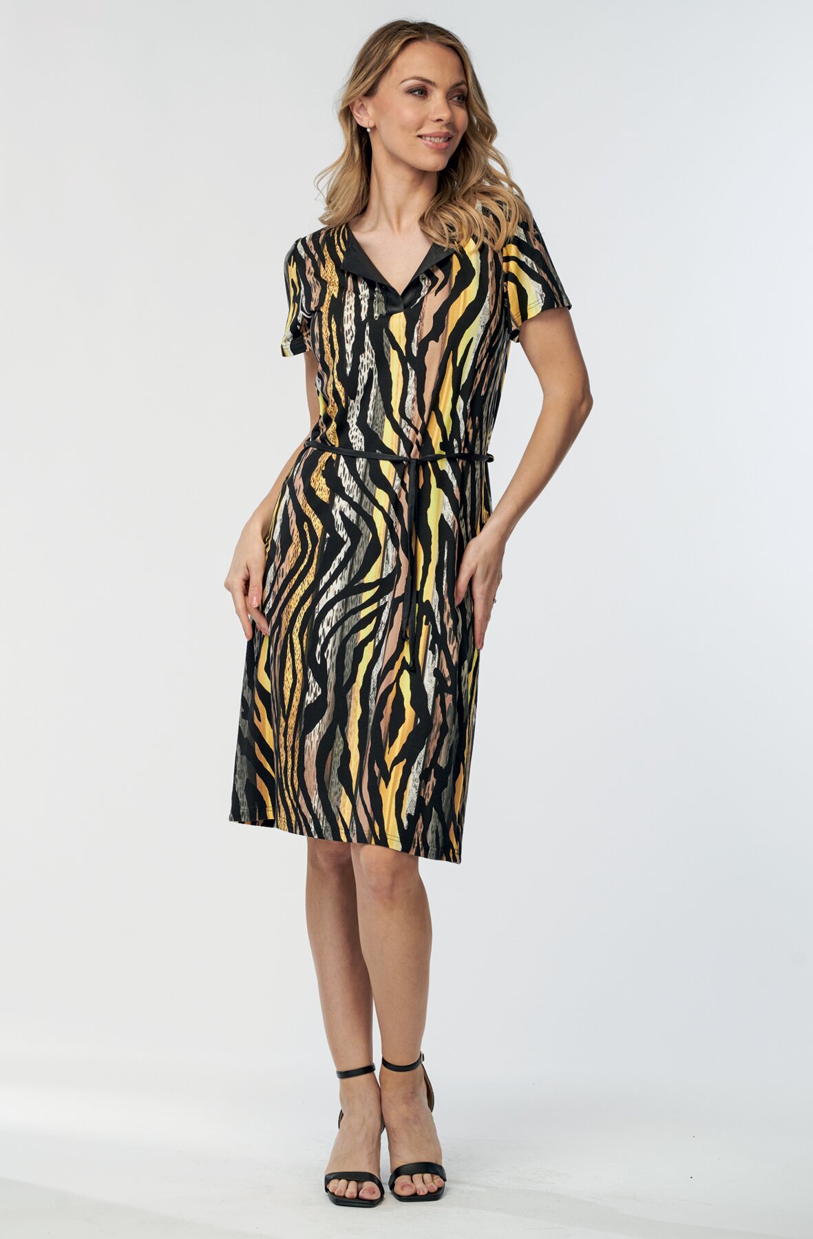 Elegantní dámské šaty s kontrastní légou a krátkými rukávy. Šaty mají v pase kontrastní šňůrku na zavázání.