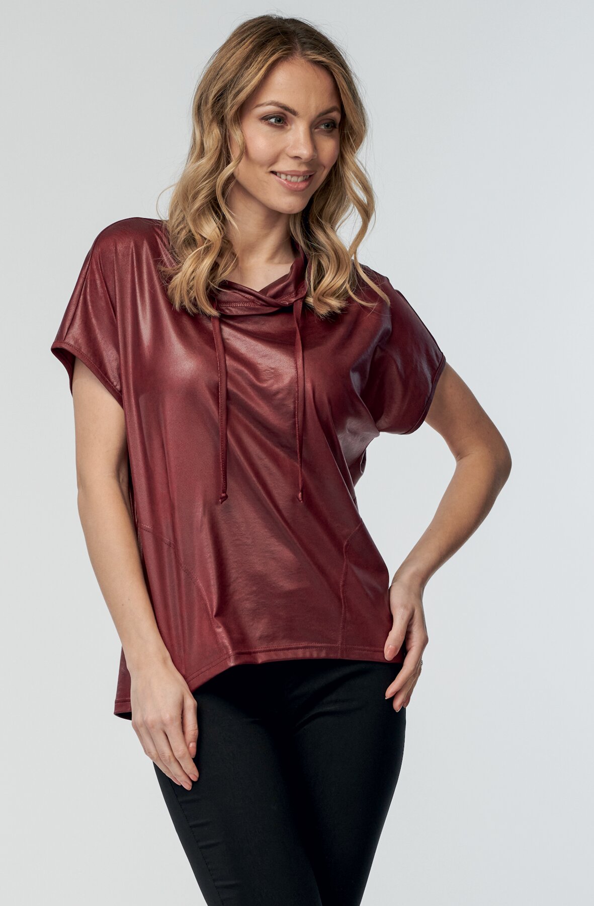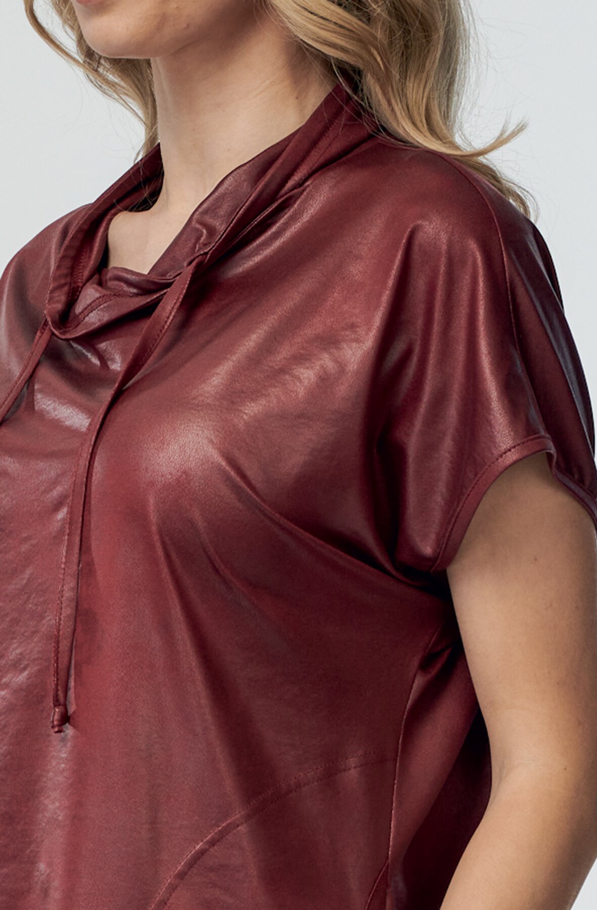 Volnější kimonová halenka s přeloženým stojacím límcem se šňůrkou. Halenka má kapsy v bočních švech a je vyrobená z lehkého materiálu imitujícího kůži.